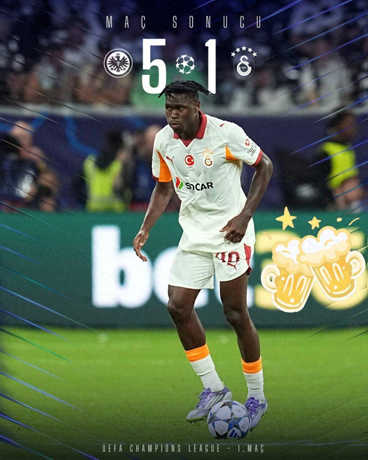 加拉塔萨雷虽然在土超是山大王,本赛季豪取五连胜开局,打入了15个进球,场均3球,仅丢1球,但到了欧冠赛程,立马变为送分童子,客场1-5惨败给德甲仅排名第五的法兰克福,真是窝里横的土超第一豪门!